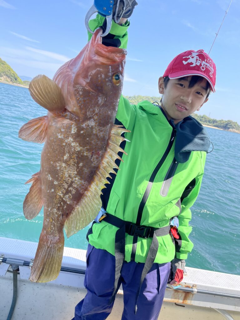 速攻舵をきり、ひと流し目からスーパー中学生が50㎝のアコウも混ざりながら鯛をゲットです!